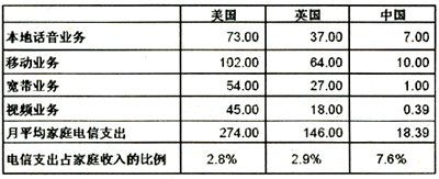 2005年美國、英國和中國電信消費支出構成比例分析(單位:美元)