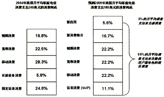作為可以提供整合平臺的服務,IMS在消費者和企業(yè)應用上都會為運營商帶來收入的增長。首先分析IMS可能為消費者帶來的收入增長。比較美國2004年和2009年預計的電信消費支出構成。2009年,95%的消費支出仍然是既有的業(yè)務,運營商通過提供業(yè)務包和服務包捆綁既有用戶群。5%的新消費支出是IMS新應用的主戰(zhàn)場。
