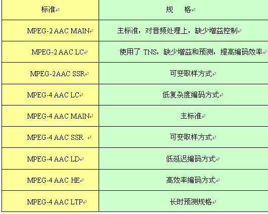 目前國(guó)際上對(duì)音頻處理技術(shù)上標(biāo)準(zhǔn)較多,在對(duì)下一代實(shí)時(shí)交互音頻處理上可以采用MPEG-1Layer2或AAC系列音頻,對(duì)選用標(biāo)準(zhǔn)的原則是,音頻頻響范圍要達(dá)到22KHz,這樣就幾乎可以覆蓋了人耳聽(tīng)覺(jué)的全部范圍,甚至在高頻方面還有所超越,能夠使現(xiàn)場(chǎng)音頻得到真實(shí)自然的還原,并且在還原時(shí)可以采用雙聲道立體聲回放,使整個(gè)視頻通訊的聲音有更強(qiáng)的臨近感,達(dá)到CD級(jí)音質(zhì)。同時(shí)在對(duì)鏈路帶寬的適應(yīng)和編解碼效率上達(dá)到最佳。下表列出AAC的9種規(guī)格。
