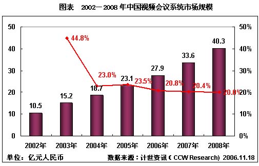 在2003年的井噴式發(fā)展之后,視頻會議系統(tǒng)市場發(fā)展速度開始進入低速發(fā)展階段,市場逐漸出現(xiàn)飽和的趨勢。計世資訊(CCW Research)最新視頻會議報告數(shù)據(jù)顯示,從2003年非典時期視頻會議市場井噴式發(fā)展之后,2006年視頻會議系統(tǒng)的增長率開始下降,如何開發(fā)新的產(chǎn)品,成為視頻會議系統(tǒng)市場繼續(xù)發(fā)展的關(guān)鍵。而3G商用的到來,由此產(chǎn)生的移動視頻業(yè)務(wù)也必將成為未來移動通信新的市場增長點,可以說,移動信息化建設(shè)將為視頻會議系統(tǒng)開拓一片新的藍(lán)海。