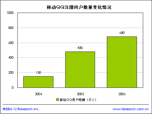 近兩年移動(dòng)QQ的市場(chǎng)規(guī)模迅速擴(kuò)大,iResearch研究結(jié)果顯示2006年移動(dòng)QQ用戶規(guī)模達(dá)到680萬(wàn)人,移動(dòng)QQ所帶來的現(xiàn)金收入成為騰訊上市公司最重要的收入之一。移動(dòng)IM與互聯(lián)網(wǎng)IM最大的不同在于產(chǎn)業(yè)鏈移動(dòng)運(yùn)營(yíng)商的參與。艾瑞認(rèn)為互聯(lián)互通是移動(dòng)IM產(chǎn)業(yè)整合和發(fā)展必然趨勢(shì)。