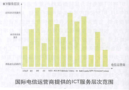 ICT服務的范圍大致可分為三個層次,一是面向網(wǎng)絡通信設施(包括網(wǎng)絡規(guī)劃、網(wǎng)絡系統(tǒng)集成、外包管理等)的服務,二是面向IT應用系統(tǒng)(包括軟件系統(tǒng)支持與維護、系統(tǒng)集成、應用托管等)的服務,三是面向業(yè)務流程系統(tǒng)(包括系統(tǒng)咨詢、業(yè)務流程外包等)的服務。從客戶視角來看,第三種服務的層次最高,第一種服務的層次最低,而電信運營商提供的ICT服務層次越高,則表明其在該領域拓展的范圍越廣。上述國際電信運營商提供的ICT服務層次范圍如下圖所示。