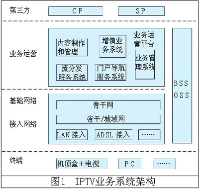 IPTV業(yè)務(wù)系統(tǒng)架構(gòu)可分為四層: 第三方業(yè)務(wù)提供者如CP和SP、業(yè)務(wù)運(yùn)營(yíng)層、網(wǎng)絡(luò)承載層和用戶終端層(如圖1)。