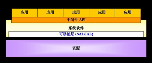 應(yīng)用層不直接調(diào)用和操作資源,而是由系統(tǒng)軟件層對資源進(jìn)行抽象和封裝,提供給應(yīng)用層調(diào)用。這個中間層分離了硬件和應(yīng)用層,使應(yīng)用層具有非常強(qiáng)的可移植性。系統(tǒng)軟件層主要包括中間件核心層模塊和可移植層模塊。