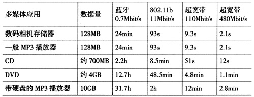 2.0接口相當,遠遠高于無線局域網(wǎng)802.11b的11 Mbit/s,也比下一代無線局域網(wǎng)802.11a/g的54 Mbit/s高出近一個數(shù)量級。UWB通信的功耗較低,能更好地滿足使用電池的移動設(shè)備的要求。另外,UWB信號的功率譜密度非常低,信號難以被檢測到,再加上采用的跳頻、直接序列擴頻等擴頻多址技術(shù),使非授權(quán)者很難截獲傳輸?shù)男畔,因而安全性非常好。?是一些典型的實時多媒體應用對不同無線傳輸技術(shù)的數(shù)據(jù)傳輸速率的要求。從表中可以看出,如果采用無線的方式來進行傳輸,只有UWB技術(shù)可以滿足各種應用的要求。