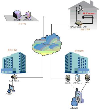 IP Camera在海外已屬于逐漸成熟市場,2007年全球?qū)⒂谐^500萬臺的出貨。據(jù)專業(yè)機構預測,IP Camera市場將在2009年超越模擬Camera(IDC)市場達到并超過10億美元(IMS Research)。而截至2006年7月,全球移動用戶數(shù)已經(jīng)達到了24.5億,并以每天約100萬的速度在增長。在此基礎上,伴隨著固定移動融合(FMC),隨時隨地的視頻瀏覽和安全監(jiān)控相結合——手機IP監(jiān)控需求應運而生,尤其是在無線網(wǎng)絡帶寬發(fā)達的國家和地區(qū),其應用領域十分廣闊,包括家庭監(jiān)控(包括小孩照料、寵物看管和財產(chǎn)保護等)、專業(yè)監(jiān)控、交通監(jiān)測、實時廣告等業(yè)務已經(jīng)開始為大眾所接受。其業(yè)務模型如下: