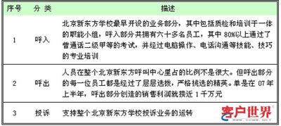 北京新東方學(xué)校呼叫中心在1999年還只是3部咨詢電話,不到10名工作人員。到今年,已經(jīng)擁有36個座席以及72名經(jīng)過專業(yè)培訓(xùn)的座席代表,平均每日接聽3500通電話。