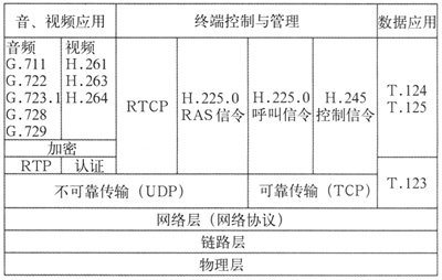 H.323協(xié)議是一個(gè)龐大的協(xié)議族,其中又包括許多相關(guān)的子協(xié)議,形成了一個(gè)協(xié)議棧,如圖2所示。