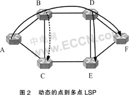 ....用圖2所示的6節(jié)點光網絡來闡述整個組播信令流程。與IP組播不同,點到多點LSP并不需要額外的組播組管理協(xié)議。這是因為葉子節(jié)點的地址直接被包括在請求中,而不像IP組播中僅僅只是使用一個D類地址。所有的組播樹請求都將用一個三元組來表示{T,a,L},其中T是組播樹的標識符,s是源節(jié)點,L是組播樹的葉子集合。當T等于O的時候意味著這是一個組播樹建立請求。例如,源節(jié)點A希望建立一個到葉子E和F的組播樹,那么這個請求就被表示為{0,A,{E,F}}。當這顆樹被建立后,它將被分配一個全局唯一的標識符,比如1。請求{1,A,{C1}}和{1,A,{F}}則分別意味著將葉子C嫁接到組播樹1和將葉子F從組播樹1中剪除。如果想刪除整棵樹,只需要將組播樹1的所有葉子都剪除即可,即{1,A,{C,E}}。