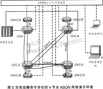 ....圖5顯示了一個用來實現組播信令協(xié)議的4節(jié)點ASON網絡演示環(huán)境。圖中OXC的核心交換矩陣是基于時分交換,交換粒度為一個SDH
