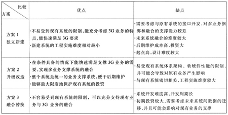 由于國內(nèi)電信運(yùn)營商一般已建有業(yè)務(wù)支撐系統(tǒng),因此在進(jìn)入到3G時(shí)代后就面臨著如何選擇3G融合計(jì)費(fèi)系統(tǒng)建設(shè)方式的問題。3G融合計(jì)費(fèi)系統(tǒng)的建設(shè)方案主要有獨(dú)立新建、升級(jí)改造、融合替換三種。三種不同的建設(shè)方案對(duì)比分析見表2。