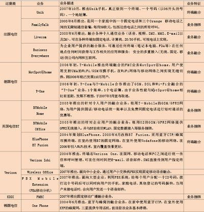 從全球范圍來看,大多數(shù)重要的固定運(yùn)營商、移動運(yùn)營商和綜合性運(yùn)營商都已經(jīng)開始或計劃提供各種形式FMC業(yè)務(wù)(見表)。其中大多數(shù)運(yùn)營商提供捆綁業(yè)務(wù)和簡單的融合業(yè)務(wù),而歐美的一些頂尖運(yùn)營商已推出基于融合終端的FMC業(yè)務(wù)。