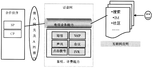 電信各種業(yè)務(wù)能力經(jīng)過(guò)封裝后以Web Services的方式向外開放,由互聯(lián)網(wǎng)應(yīng)用調(diào)用這些服務(wù)能力,提供基于互聯(lián)網(wǎng)的新型話音型業(yè)務(wù),互聯(lián)網(wǎng)應(yīng)用提供商作為SP與電信運(yùn)營(yíng)商進(jìn)行收入分成,同時(shí)又有大量的CP作為新型話音應(yīng)用的內(nèi)容提供商加入價(jià)值鏈,運(yùn)營(yíng)商在價(jià)值鏈上充當(dāng)主導(dǎo)作用。