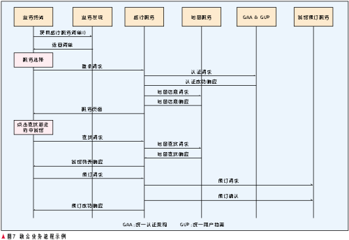 首先王先生的PDA通過歸屬網(wǎng)絡(luò)的業(yè)務(wù)發(fā)現(xiàn)服務(wù)器獲得旅行服務(wù)的主頁列表,他選擇一家訪問其旅行服務(wù),旅行服務(wù)通過其歸屬網(wǎng)絡(luò)的GAA&GUP對該終端進行認證以及提供旅行服務(wù)的授權(quán),成功后,旅行服務(wù)向地圖服務(wù)請求地圖信息并隨服務(wù)頁面一齊返回給終端,王先生點擊查找“離我最近的中餐館”按鈕,旅行服務(wù)將請求代理轉(zhuǎn)發(fā)給地圖服務(wù),后者返回中餐館列表(用戶的位置信息可以由用戶上報,或者由旅行服務(wù)查詢用戶歸屬網(wǎng)絡(luò)的位置服務(wù)獲得),旅行服務(wù)轉(zhuǎn)發(fā)給終端,當王先生選擇一個中餐館并預(yù)訂時,旅行服務(wù)調(diào)用該餐館的預(yù)訂服務(wù),訂單傳給相應(yīng)服務(wù)人員,流程完成。