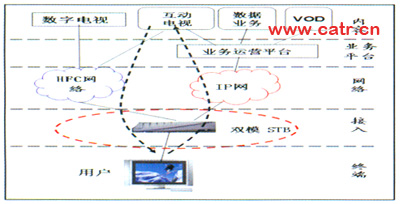 這種模式的合作點主要在接入層面,以提供雙模機頂盒為主要方法。固網(wǎng)公司和廣電發(fā)揮各自資源優(yōu)勢進行合作。廣電節(jié)目傳送由廣電負責(zé),同網(wǎng)提供寬帶增值服務(wù),兩者分業(yè)經(jīng)營,地位平等。