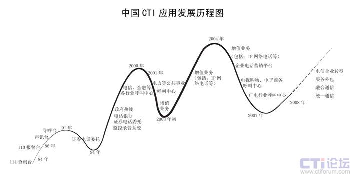 CTI在中國已經(jīng)發(fā)展了二十多年,已經(jīng)從最早的電信行業(yè)CTI應(yīng)用發(fā)展到金融(包括銀行、保險、證劵及基金)、電力、郵政、企業(yè)(包括煙草、汽車、家電、IT、互聯(lián)網(wǎng)、旅游、報業(yè)、航空、物流、醫(yī)療、公共事業(yè)等)、政府、軍隊(duì)等各行各業(yè)的應(yīng)用。特別在1995年到2001時期,是CTI應(yīng)用發(fā)展最快,普及面最廣的時期,也是CTI市場進(jìn)入了第二次高潮;從2002開始增值業(yè)務(wù)是整個CTI行業(yè)的突破口,整個行業(yè)以增值業(yè)務(wù)為主,CTI市場進(jìn)入了第三次高潮;從2006年開始,增值業(yè)務(wù)進(jìn)入了衰退期,整個CTI行業(yè)市場出現(xiàn)了嚴(yán)重的危機(jī),加上新的技術(shù)出現(xiàn),技術(shù)的換代,對原來的傳統(tǒng)語音產(chǎn)品和公司是個致命的打擊。