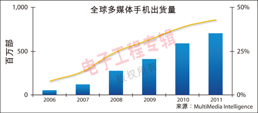 圖1:全球多媒體手機(jī)交貨量及占總數(shù)量的百分比