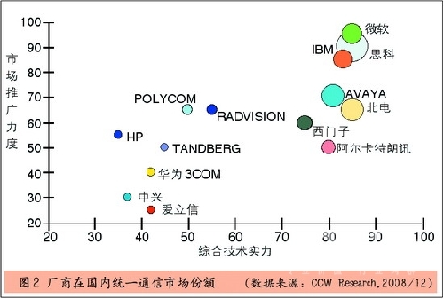 從當前國內統(tǒng)一通信市場競爭格局來看,在綜合技術實力方面,根據(jù)廠商所提供的統(tǒng)一通信解決方案中所能夠提供的各種溝通方式融合的程度以及每個具體功能技術水平等綜合因素考慮,處于前幾位的分別是思科、微軟、北電、IBM和Avaya,它們的產(chǎn)品線比較長,產(chǎn)品功能也相對比較全面。