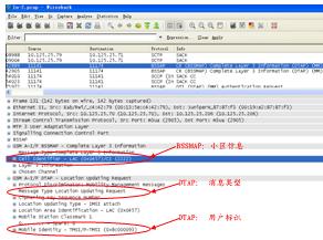 以上是一個用戶開機的信令過程,在BSSMAP消息層中,可以獲取CGI=0X0457-2222;在DTAP消息層中,可以獲得獲得本次消息類型為LocationUpdatingREQ,同時用戶標識為TMSI=0X8c000093,通過對對之前或之后(簽權(quán)、IDREQ/RSP)等信令的關(guān)聯(lián),可以獲得用戶IMSI、MSISDN和CGI的對應(yīng)關(guān)系。其它信令過程,如周期性位置更新、短信收發(fā)、主被叫等,和以上分析過程類似。