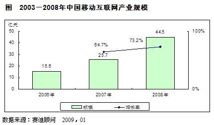2008年中國(guó)移動(dòng)互聯(lián)網(wǎng)產(chǎn)業(yè)以73.2%的高速增長(zhǎng),實(shí)現(xiàn)了44.5億元的收入規(guī)模。