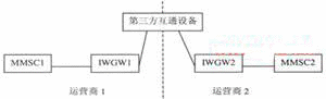 為實(shí)現(xiàn)不同運(yùn)營商的用戶之間相互發(fā)送和接收多媒體消息,需要在不同運(yùn)營商的多媒體消息中心之間實(shí)現(xiàn)互通。該互通需要多媒體消息中心(MMSC)與互通設(shè)備(IWGW)的連接、IWGW之間的連接實(shí)現(xiàn)。當(dāng)一個(gè)運(yùn)營商的網(wǎng)絡(luò)用戶向另一個(gè)運(yùn)營商的網(wǎng)絡(luò)用戶發(fā)送多媒體消息時(shí),該多媒體消息經(jīng)發(fā)送方用戶歸屬的MMSC通過IWGW提交給接收方用戶歸屬的多媒體消息中心,由接收方用戶歸屬的MMSC向其網(wǎng)內(nèi)用戶發(fā)送。網(wǎng)間多媒體消息業(yè)務(wù)互通網(wǎng)絡(luò)結(jié)構(gòu)中主要包括多媒體消息中心(MMSC),互通設(shè)備(IWGW)以及相關(guān)的輔助設(shè)備等。IWGW是指不同運(yùn)營商網(wǎng)絡(luò)之間的多媒體消息互通設(shè)備。網(wǎng)間多媒體消息互通設(shè)備間的互聯(lián)可以由兩個(gè)運(yùn)營商的IWGW直接連接,也可以經(jīng)過第三方互通設(shè)備轉(zhuǎn)接(見圖1、圖2)。