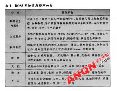 BOSS系統(tǒng)涉及的信息繁多,如何保護關鍵的數(shù)據(jù)不被泄漏是運營商非常重視的一個問題。信息分級用來評估運營商是否建立了信息資產(chǎn)管理的規(guī)范,明確了信息資產(chǎn)的內容和級別,制定了有效的安全保護措施,如果沒有,應該明確BOSS系統(tǒng)內的關鍵信息資產(chǎn)并列出清單,依據(jù)國家保密級別制定科學的信息資產(chǎn)分級標準,并作為風險評估的依據(jù)。參照國際信息系統(tǒng)安全標準BS7799/ISO17799對信息資產(chǎn)的描述和定義,可以將BOSS系統(tǒng)信息資產(chǎn)按照表1的方法進行分類。