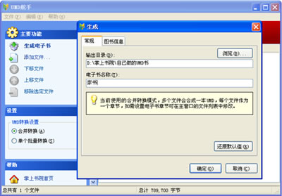 點(diǎn)擊“添加文件”,將你想要轉(zhuǎn)換的電子書添加至軟件窗口,大批量轉(zhuǎn)換的用戶可一次性選中多個文件添加,添加完畢后,你可以隨時(shí)通過“上移文件”和“下移文件”按鈕來調(diào)整你文件擺放的位置,或者移除不需要轉(zhuǎn)換的文件。確認(rèn)后,選擇合并轉(zhuǎn)換或是單個批量轉(zhuǎn)換,合并轉(zhuǎn)換是將添加的文件合并成一本UMD電子書,單個批量轉(zhuǎn)換是每個文件生成一本UMD電子書。設(shè)置完后點(diǎn)擊“生成電子書”,在彈出的對話框中設(shè)置輸出目錄、電子書名稱、電子書封面、作者、來源后點(diǎn)擊確認(rèn),出現(xiàn)正在轉(zhuǎn)換的進(jìn)度條,完成制作后會自動打開電子書所在的目錄,你的電子書制作完成,是不是非常簡單。