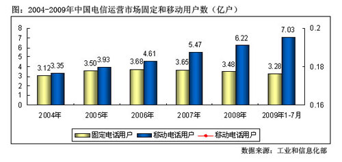圖: 2004-2009年中國(guó)電信運(yùn)營(yíng)市場(chǎng)固定和移動(dòng)用戶(hù)數(shù)