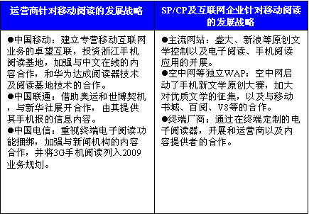 隨著3G的啟動(dòng),越來(lái)越多的傳統(tǒng)互聯(lián)網(wǎng)巨頭、運(yùn)營(yíng)商、手機(jī)廠(chǎng)商等紛紛介入無(wú)線(xiàn)互聯(lián)網(wǎng)領(lǐng)域,而更多的新興企業(yè)也加入到競(jìng)爭(zhēng)中來(lái)。從目前市場(chǎng)的發(fā)展情況來(lái)看,運(yùn)營(yíng)商由于其依托的用戶(hù)資源以及對(duì)網(wǎng)絡(luò)資源的控制,在移動(dòng)閱讀產(chǎn)業(yè)中占據(jù)了優(yōu)先的主動(dòng)權(quán),然而針對(duì)移動(dòng)閱讀,其內(nèi)容資源環(huán)節(jié)稍顯薄弱,傳統(tǒng)電子書(shū)產(chǎn)品資源豐富然而涉及版權(quán)問(wèn)題,不能大規(guī)模應(yīng)用于移動(dòng)領(lǐng)域,因此優(yōu)質(zhì)的內(nèi)容將是移動(dòng)閱讀產(chǎn)業(yè)發(fā)展的核心競(jìng)爭(zhēng)優(yōu)勢(shì)。針對(duì)此,運(yùn)營(yíng)商也相應(yīng)加大了對(duì)優(yōu)質(zhì)內(nèi)容的挖掘和控制。以中國(guó)移動(dòng)為例,于2009年3月和浙江省人民政府代表簽署了長(zhǎng)期戰(zhàn)略合作協(xié)議,并將在兩年內(nèi)投入5000萬(wàn)元,支持浙江手機(jī)閱讀基地的建設(shè)。
