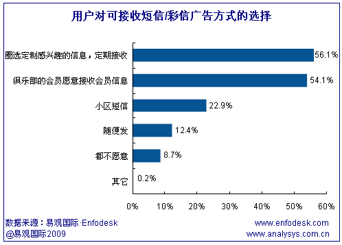 從用戶對(duì)短信廣告的接受程度來(lái)看,用戶對(duì)于自己感興趣領(lǐng)域的短信廣告并不反感,甚至樂(lè)于接受或定制。根據(jù)易觀國(guó)際Enfodesk發(fā)布的用戶調(diào)研數(shù)據(jù),56.1%的用戶愿意定制自己感興趣的信息,54.1%的用戶愿意接受會(huì)員信息,只有8.7%的用戶不愿意接受任何形式的短信/彩信廣告。但是這類用戶樂(lè)于接受的短信廣告反而一般有固定的端口號(hào),更容易被攔截,因此易觀國(guó)際(Analysys