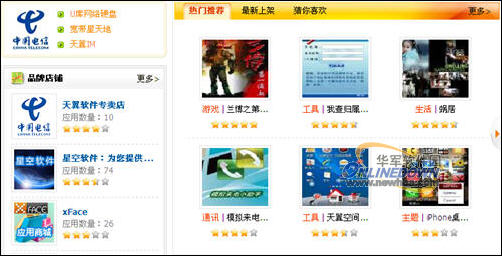 天翼空間應(yīng)用商城由四川電信與華為公司合作建設(shè),并于9月1日公測(cè)上線。天翼空間應(yīng)用商城分為游戲、主題、娛樂(lè)、生活、通訊、閱讀、旅行、商務(wù)、教育、財(cái)經(jīng)、工具等11個(gè)類別,超過(guò)500款應(yīng)用產(chǎn)品,入駐店鋪100余家,并引入5家品牌店鋪。目前,天翼空間已與百度、UCWEB、360安全衛(wèi)士,大頭網(wǎng)、3G門戶網(wǎng)等多家國(guó)內(nèi)知名IT企業(yè)合作開(kāi)店。