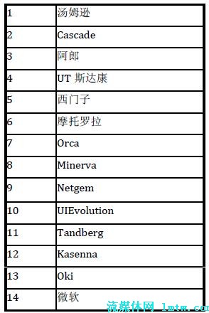 在中國市場上,UT 斯達(dá)康和中興公司暫時領(lǐng)先于其他公司。其中,UT 斯達(dá)康在海外也有不俗的表現(xiàn),如在印度和日本市場等;華為公司可以借助其整體解決方案的實力,有機(jī)會在下一代基于IMS 的IPTV 解決方案中脫穎而出。MRG 曾經(jīng)在2007 年3 月公布過一個市場調(diào)查,對IPTV 中間件及其市場影響力進(jìn)行了一個排名,具體的結(jié)果見表1。