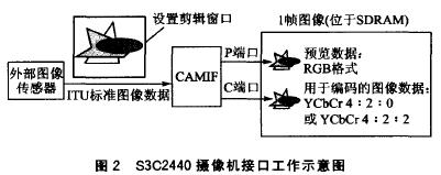 SAA7113 的CE 引腳與S3C2440 的一個GPIO 引腳相連,這樣可以控制SAA7113的工作狀態(tài)。當無須采集圖像時,將該GPIO口輸出低電平,使SAA7113芯片處于低功耗狀態(tài),節(jié)省電能的消耗。對照圖2和圖3可以看出,SAA7113芯片就是圖2的“外部圖像傳感器”。它向嵌入式系統(tǒng)的攝像機接口提供了采樣到的標準ITU視頻數(shù)據(jù)。這些數(shù)據(jù)經(jīng)過DMA的P端口或C端口控制傳輸?shù)搅藘却,這樣就可以在內存中對圖像數(shù)據(jù)作進一步的加工處理。