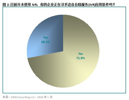 28.1%目前還沒有使用IVR系統(tǒng)的公司正在積極尋求語音自助服務(wù)解決方案來幫助自己達(dá)成目標(biāo),這一數(shù)字高得頗讓人驚訝。見圖2。經(jīng)濟(jì)衰退促使那些曾經(jīng)對(duì)使用自助服務(wù)技術(shù)猶豫不決的企業(yè)下定決心投資購買此類解決方案。一個(gè)具有正確規(guī)劃、設(shè)計(jì)和投放過程的IVR系統(tǒng)能夠?qū)⑷斯ご硖幚淼碾娫捔拷档?0%到90% (長期來說),具體數(shù)字有賴于聯(lián)絡(luò)中心的目的以及編入解決方案內(nèi)部的任務(wù)。IVR用戶的增長勢(shì)頭有望在經(jīng)濟(jì)形勢(shì)好轉(zhuǎn)之后仍然延續(xù)下去。一個(gè)經(jīng)過良好設(shè)計(jì)并成功實(shí)施的IVR方案所帶來的利益和節(jié)約的成本是即便最不情愿使用它的經(jīng)理都不得不承認(rèn)的。