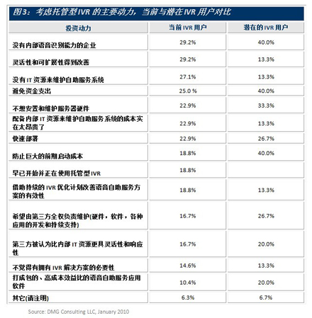 圖3顯示了現(xiàn)有和潛在的語音自助服務(wù)用戶尋求托管型IVR的主要?jiǎng)恿碓础撛诳蛻粽J(rèn)真考慮托管型IVR解決方案的兩個(gè)很明顯的原因是避免大的資金開銷和最小化啟動(dòng)成本,在經(jīng)濟(jì)不景氣時(shí)這樣的做法并不令人意外。另外還有個(gè)原因是希望一邊使用該方案一邊積累經(jīng)驗(yàn)和知識(shí)。