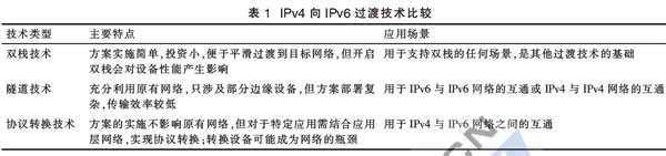 每種過渡技術(shù)都有一定的適用場(chǎng)景,過渡技術(shù)的選擇,不僅要關(guān)注過渡過程對(duì)用戶體驗(yàn)的影響,還應(yīng)考慮網(wǎng)絡(luò)、終端和平臺(tái)的改造成本以及技術(shù)演進(jìn)的復(fù)雜性。從表1可以看出,作為其他過渡技術(shù)的基礎(chǔ),雙棧技術(shù)是實(shí)現(xiàn)IPv6節(jié)點(diǎn)與IPv4節(jié)點(diǎn)兼容的最直接方式,因此,在三網(wǎng)融合環(huán)境下,應(yīng)遵照雙棧技術(shù)為主和其他過渡技術(shù)為輔的原則,針對(duì)不同企業(yè)的網(wǎng)絡(luò)及業(yè)務(wù)現(xiàn)狀,靈活調(diào)整策略,實(shí)現(xiàn)IPv6的引入。