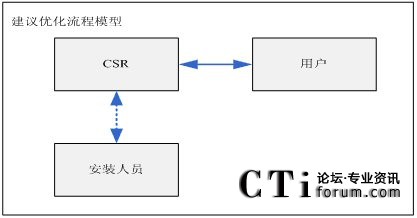 對于客服中心來講,當(dāng)受理了用戶的需求時(shí),CSR與用戶便成了服務(wù)流程中的關(guān)鍵角色,安裝人員只是CSR的一個(gè)協(xié)作角色(內(nèi)部流程下游角色)。如果在為用戶提供服務(wù)過程中,將安裝人員“引入”流程中,無疑將影響流程的執(zhí)行效果。另外,讓用戶代替CSR去聯(lián)系“安裝人員”這更加影響用戶的感受。