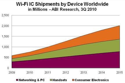 Wi-Fi技術(shù)現(xiàn)已被用于幾乎所有筆記本和上網(wǎng)本、智能電話和游戲設(shè)備。電話、音頻播放器、打印機(jī)、機(jī)頂盒以及其他消費類電子設(shè)備對Wi-Fi技術(shù)的采用率也在不斷增加,來自Wi-Fi聯(lián)盟和多家調(diào)研機(jī)構(gòu)的數(shù)據(jù)印證了這種市場增長趨勢。2009年,僅在中國銷售的具備Wi-Fi功能的筆記本電腦就達(dá)到800萬臺,全球Wi-Fi設(shè)備認(rèn)證數(shù)量則增加了約50%,消費類電子設(shè)備和電話數(shù)量增加了100%以上。截止到2010年7月,消費類電子設(shè)施與電話類產(chǎn)品的認(rèn)證數(shù)量已經(jīng)超過了2009年全年數(shù)量,預(yù)計全年售出約8億臺Wi-Fi設(shè)備。