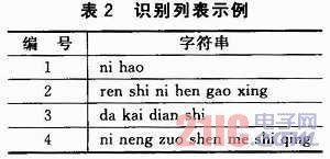 、趯懭胱R別列表。列表的規(guī)則是,每個(gè)識別條目對應(yīng)一個(gè)特定的編號(1個(gè)字節(jié)),編號可以相同,可以不連續(xù),但是數(shù)值要小于256(00H~FFH)。本芯片最多支持50個(gè)識別條目,每個(gè)識別條目是標(biāo)準(zhǔn)普通話的漢語拼音(小寫),每2個(gè)字(漢語拼音)之間用一個(gè)空格間隔。本文中采取了連續(xù)不同編號的識別條目,表2是簡單的示例。