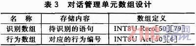 為了方便進(jìn)行對話的管理,本文中設(shè)計(jì)了一個(gè)對話管理單元,用于對等待識別的語句和等待執(zhí)行的命令進(jìn)行存儲,在主控制器中通過定義二維數(shù)組來實(shí)現(xiàn)。LD3320每次識別最多可以設(shè)置50項(xiàng)候選識別句,每個(gè)識別句可以是單字、詞組或短句,長度為不超過10個(gè)漢字或者79個(gè)字節(jié)的拼音串;谏鲜鲈,本文設(shè)計(jì)的對話管理數(shù)組如表3所列。