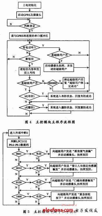 在主控模塊主程序中系統(tǒng)一直在檢測(cè)是否有來電和新短信信息,當(dāng)有來電時(shí)系統(tǒng)會(huì)自動(dòng)掛斷電話,然后判斷是不是超級(jí)用戶:是,啟動(dòng)攝像頭拍照,并發(fā)送給超級(jí)用戶;不是,系統(tǒng)將不理睬,繼續(xù)檢測(cè)。當(dāng)是短消息時(shí),判斷是否是超級(jí)用戶:不是,判斷短信內(nèi)容是“888888 ”否,是則系統(tǒng)綁定該號(hào)碼為超級(jí)用戶,并回復(fù)“超級(jí)用戶綁定成功”;是,判斷短信內(nèi)容是否是“bf”或“cf”,是“bf”系統(tǒng)進(jìn)入布防狀態(tài),并回復(fù)“布防成功”,是“cf”系統(tǒng)撤防,回復(fù)“撤防成功”。