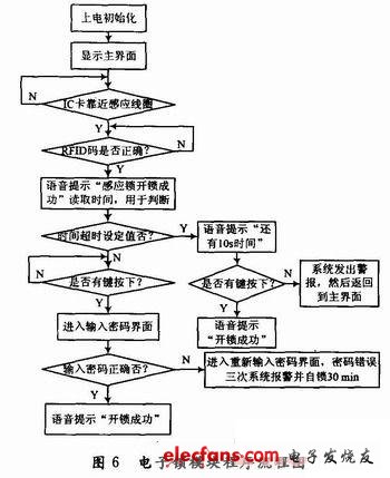 如圖2所示,電子鎖原始密碼和用戶設(shè)定密碼已存于外部存儲(chǔ)器E2PROM內(nèi),用戶要開門需先用電子感應(yīng)鑰匙開RFID碼感應(yīng)鎖,當(dāng)感應(yīng)鎖成功開鎖時(shí),系統(tǒng)將發(fā)出語(yǔ)音提示“感應(yīng)鎖開鎖成功”,然后輸入先前設(shè)定的密碼,密碼正確后,系統(tǒng)發(fā)出語(yǔ)音提示“開鎖成功”,否則提示“輸入密碼錯(cuò)誤”。輸入密碼三次以上錯(cuò)誤,系統(tǒng)將報(bào)警并自鎖30 min。整個(gè)開鎖時(shí)間不能超過30 s,否則系統(tǒng)發(fā)出警報(bào)聲,以防止盜賊在短時(shí)間內(nèi)利用萬能工具開鎖。系統(tǒng)待機(jī)時(shí)能在液晶上顯示時(shí)間、日期和星期等信息,實(shí)現(xiàn)友好的人機(jī)界面。