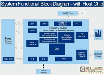 目前,支持CMMB標(biāo)準(zhǔn)的芯片產(chǎn)品多是信道解調(diào)芯片,必須要外配信源解碼處理器芯片來(lái)完成信源解碼,從而才能真正實(shí)現(xiàn)手機(jī)電視功能。SC6600V是業(yè)界首顆集成了CMMB解調(diào)和H.264信源解碼的高性能、低功耗芯片,它的集成度提高直接帶來(lái)利益點(diǎn)就是功耗和成本的降低,豐富的外圍接口以及靈活的功能選擇給這款芯片增添了增值的空間,擴(kuò)展了其應(yīng)用領(lǐng)域。