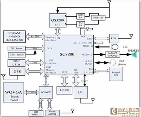 方案集成度高、設(shè)計(jì)簡(jiǎn)潔:基于SC8800、QS3200和SC6600V的設(shè)計(jì)方案框圖如下圖,僅三顆主芯片就實(shí)現(xiàn)了TD-SCDMA多媒體功能手機(jī)電視方案,方案公司硬件設(shè)計(jì)方便。