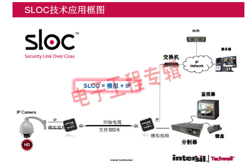 革命性的Intersil Techwell SLOCTM(Security Link over Coax)同軸電纜復(fù)合視頻傳輸解決方案是可通過一條同軸電纜同時傳輸模擬 CVBS 視頻和高清數(shù)字 IP 視頻信號的先進調(diào)制解調(diào)器解決方案,其采用最新MODEM PHY技術(shù)的傳輸解決方案,可以基于同軸電纜同時傳輸高清IP碼流和標(biāo)清模擬實時視頻。