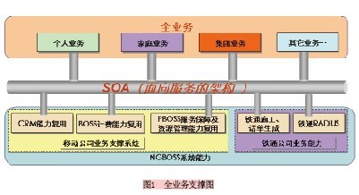 為了適應(yīng)全業(yè)務(wù)競(jìng)爭(zhēng)的需要,長(zhǎng)遠(yuǎn)規(guī)劃業(yè)務(wù)支撐系統(tǒng),移動(dòng)采用SOA(Service Oriented architecture,面向服務(wù)的架構(gòu))技術(shù)對(duì)業(yè)務(wù)支撐系統(tǒng)進(jìn)行了改造,并把鐵通資源融合進(jìn)SOA架構(gòu),改造項(xiàng)目以業(yè)務(wù)支撐系統(tǒng)SOA架構(gòu)為基礎(chǔ),進(jìn)行寬帶業(yè)務(wù)合營(yíng)和IPPBX固話業(yè)務(wù)合營(yíng),構(gòu)建基于SOA架構(gòu)的一體化服務(wù)營(yíng)銷(xiāo)支撐體系。