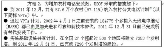 農(nóng)村電話安裝數(shù)從2007年3月的4710萬增加到2011年3月的2億8229萬,2011年12月達(dá)到3億1539萬。農(nóng)村電話數(shù)占全國電話總數(shù)的比例也從2007年的22.88%增加到2011年12月的34.04%。移動電話數(shù)量對農(nóng)村電話總數(shù)的增加貢獻(xiàn)很大。移動電話在農(nóng)村電話總數(shù)中的比重從2007年3月的73.33%提高到2011年3月的96.90%,到2011年12月達(dá)到97.53%。2011-2012年(到12月)期間,農(nóng)村電話數(shù)量的增長率為11.73%,而城市電話用戶增長率則為8.35%。個人用戶是農(nóng)村電話數(shù)增加的主要推動力,個人用戶占農(nóng)村電話總數(shù)的比重從2007年的51.87%上升到2011年2月的86.78%。為了增加農(nóng)村電話安裝總數(shù),USOF采取了以下措施,請見方框2所示。