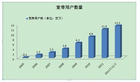 去年進(jìn)行的3G/BWA牌照拍賣有望成為一個催化劑,將寬帶接入擴(kuò)展到印度最偏遠(yuǎn)的地方。印度電信市場正在經(jīng)歷“信息革命”。為了促進(jìn)寬帶的普及,政府已經(jīng)公布并實施了多項政策(見方框3)。得益于這些政策的實施,寬帶用戶數(shù)從2005年的18萬增加到2011年3月的1187萬,2011年底達(dá)到1330萬。