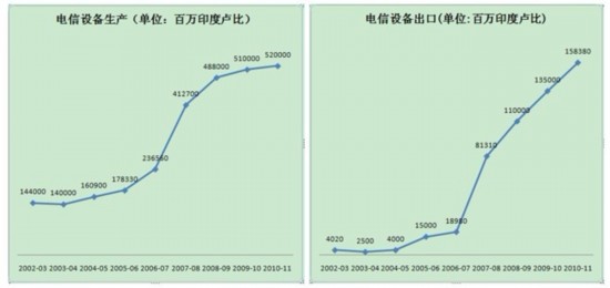 印度并不滿足于僅成為制造業(yè)中心,還計劃擴(kuò)大出口。2006-2007年,印度電信設(shè)備出口總價值約為189.8億盧比,到2010-2011年,這一數(shù)字增加到1583.8億,增長了730%。