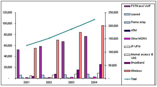IDC亞太地區(qū)通信研究機構(gòu)的負責人Sandra Ng表示,在傳統(tǒng)數(shù)據(jù)業(yè)務(wù)市場包括租用電路、幀中繼、DDN、ATM、X.25以及ISDN,其中租用電路業(yè)務(wù)的收入依然占據(jù)了主導地位,隨后是DDN業(yè)務(wù)和幀中繼。2002年這一傳統(tǒng)數(shù)據(jù)業(yè)務(wù)市場的規(guī)模有望達到100億美元,增長百分之5。